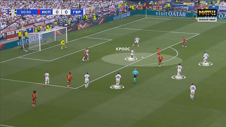 Матч сборных Германии и Испании в четвертьфинале Евро был назван многими скрытым финалом. Это действительно одни из самых сильных сборных на этом турнире, поэтому давайте разберем то, как проходила эта игра. Сборная Германия начала матч очень агрессивно, прессинговала высоко и довольно рискованно, при этом в обороне были проблемы. Например здесь, оставили Крооса одного на всю опорную зону: