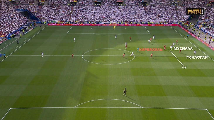 В принципе-этого и добивался Нагельсман. Создать на правом фланге ситуацию 1 в 1 против Карвахаля, потому что в этом компоненте правый защитник испанцев не является сильным игроком. Ну а дальше Мусиала получает мяч именно в этой зоне, Гюндоган спокойно убегает по флангу от Родри, а Карвахаль не просто проигрывает единоборство Мусиале 1 в 1, он даже отворачивается от него и открывает коридор для передачи вбегающему Гюндогану: