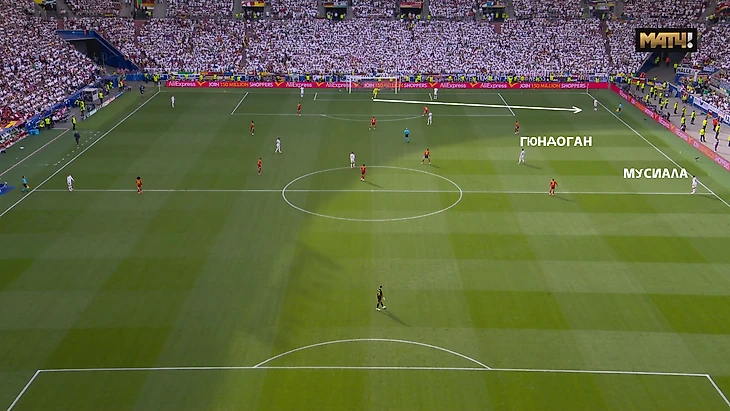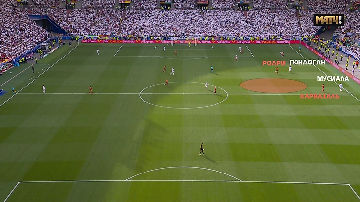Казалось бы, мяч дошел все равно тому же игроку, но на самом деле, не включая в розыгрыш центрального защитника Германия выигрывает чуть больше времени и чуть больше пространства пока испанцы будут перемещаться за своими игроками. Вот что происходит дальше: как только передача пошла-это сигнал для Гюндогана открываться в зону ближе к флангу. И теперь посмотрите на зону, которую создают немцы. Гюндоган движением вперед уводит за собой Родри, а Мусиала занимает максимально широкую позицию и стягивает к себе Карвахаля: