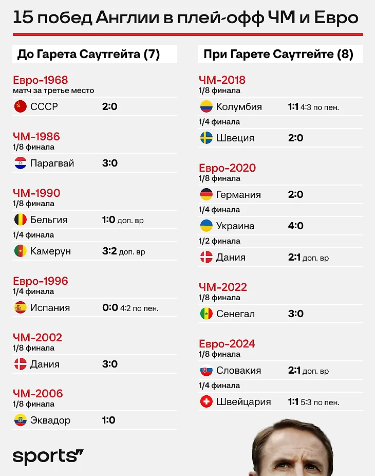 У Гарета уже есть серия из трех побед в плей-офф на одном турнире: Евро-2020 и поход к финалу. А теперь замашка на вторую подряд. До него две победы за турнир одерживал только Бобби Робсон в 1990-м (обе в дополнительное время), а перед – только Альф Рамси в золотом 1966-м (три победы).
