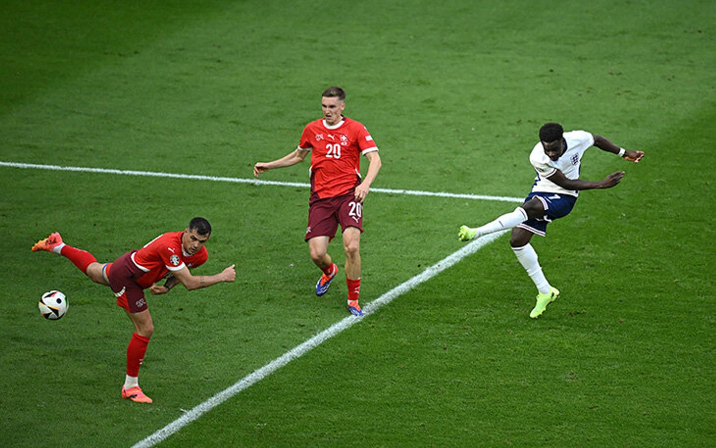 Почти весь позитив исходил от Букайо. Логично, что пытались вскрывать швейцарцев через него. Рядом с Сака, пожалуй, единственная их слабая зона – связка Рикардо Родригеса и Мишеля Эбишера (речь строго про игру без мяча – с мячом прекрасны).
