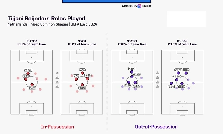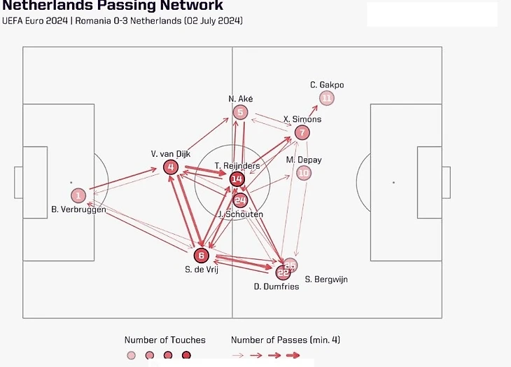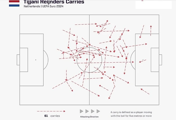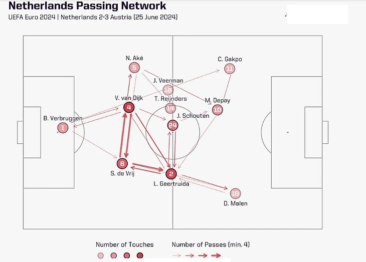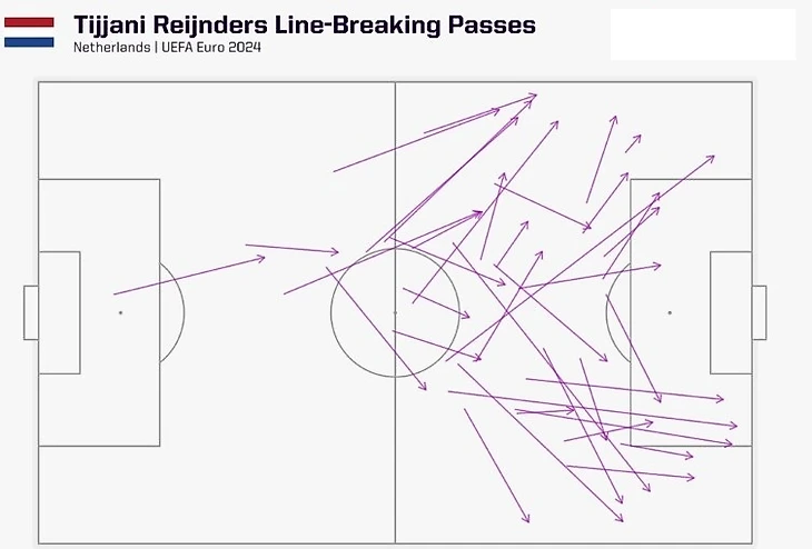 Рейндерс, безусловно, не был идеалом, он был частью сборной обороны Нидерландов, которая плохо играла, особенно в первом тайме в матче 3 тура против Австрии со счетом 3-2. Он сделал всего 33 касания, прежде чем его удалили на 65-й минуте, поскольку он, Шаутен и Джои Вирман (до его ранней замены) были продавлены интенсивностью австрийской полузащиты, которая задала тон поражению Оранье. Его блеклый цвет передач ниже подчеркивает, насколько значительным влиянием он обладает.