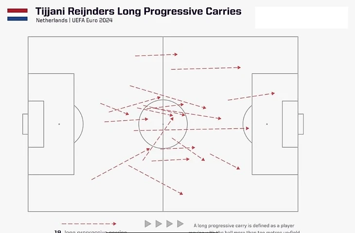 Только 10 центральных полузащитников выполнили больше передач, то есть продвинулись с мячом не менее чем на пять метров перед последними восемью Евро 2024, что по крайней мере демонстрирует его комфортное владение мячом. Но мы можем заглянуть немного глубже, и тогда мы получаем ещё больше представление о менталитете Рейндерса.