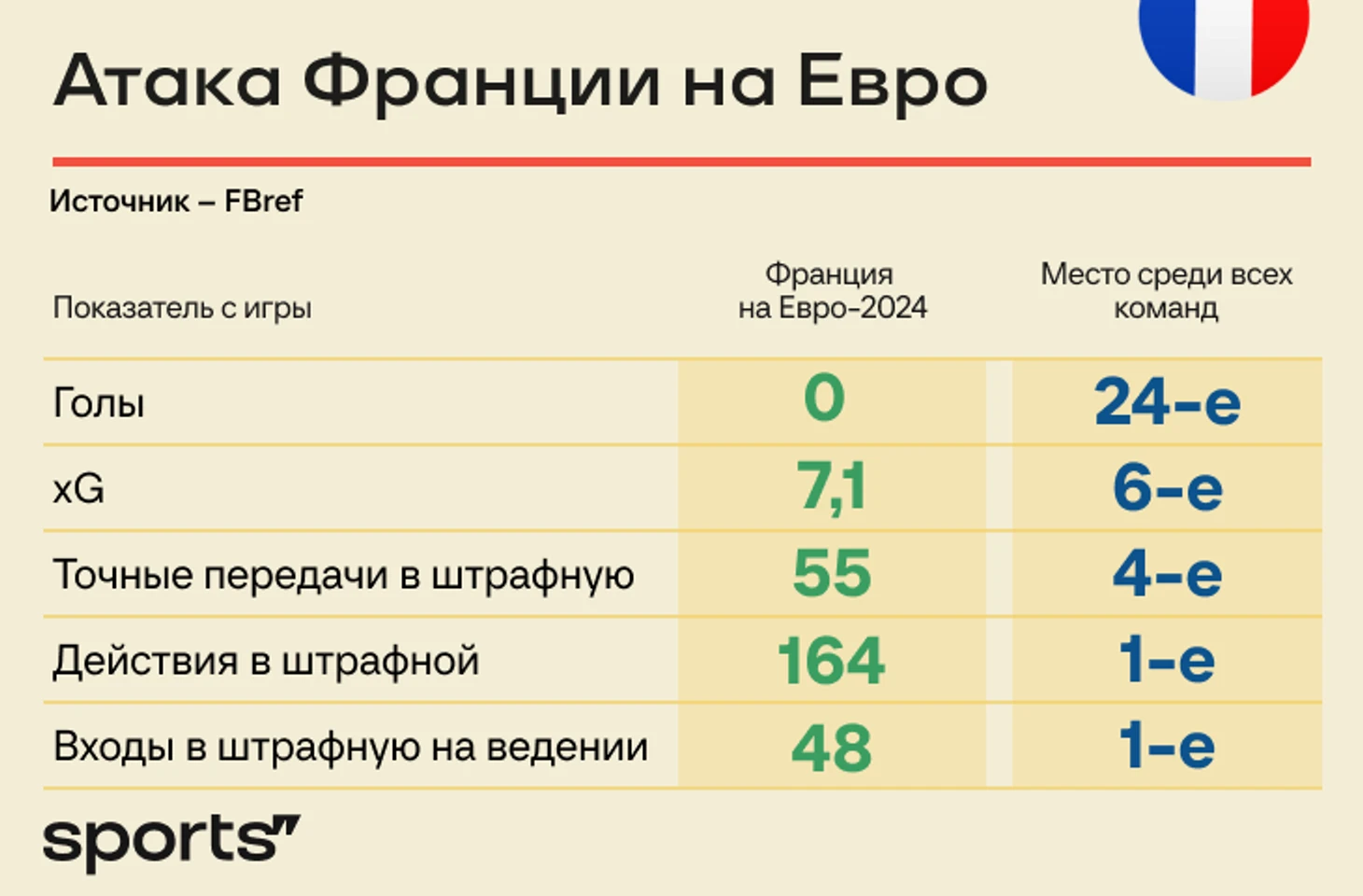 Почему так получилось? Рассмотрим два ракурса. Первый – Франция в целом испытывает проблемы с реализацией. Эффективно продвигает владение (лидеры по действиям внутри штрафной и проникновениям туда через рывки с мячом), но так и не забила ни одного гола с игры (единственные на Евро).