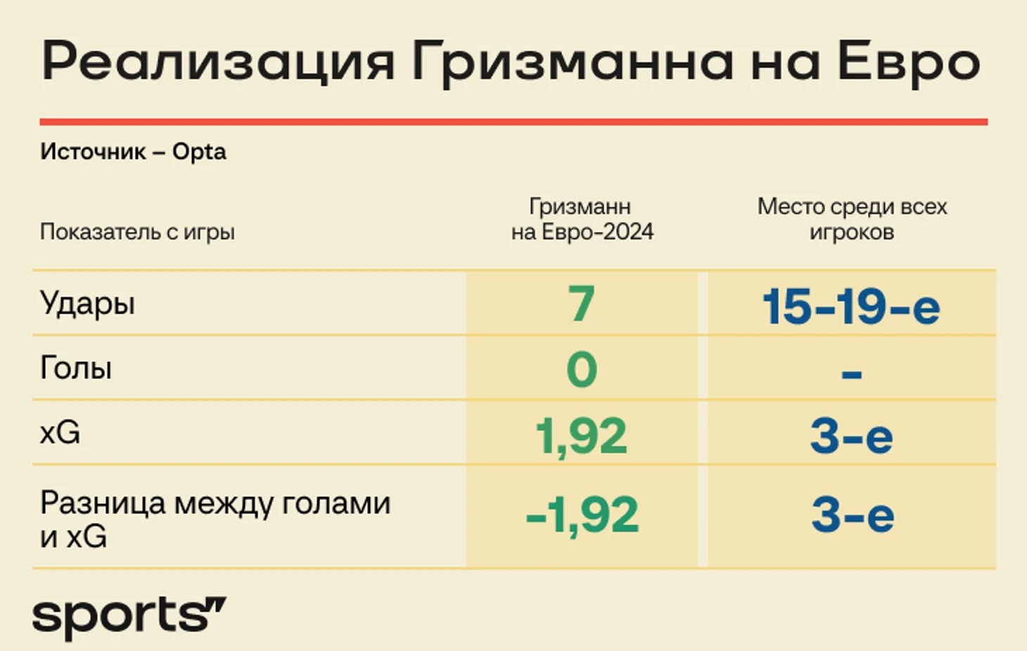 «Антуан сыграл лучше против Нидерландов. Если бы он забил один из двух своих голевых моментов, то изменил бы ход игры», – указывал Дешам напрямую. Но для оценки полезности наличие моментов важнее реализации (больше зависит от действий самого игрока и его роли и меньше от везения).