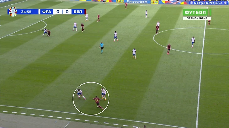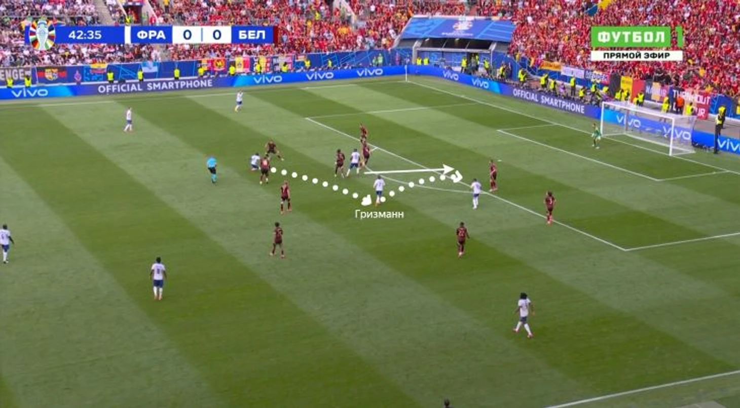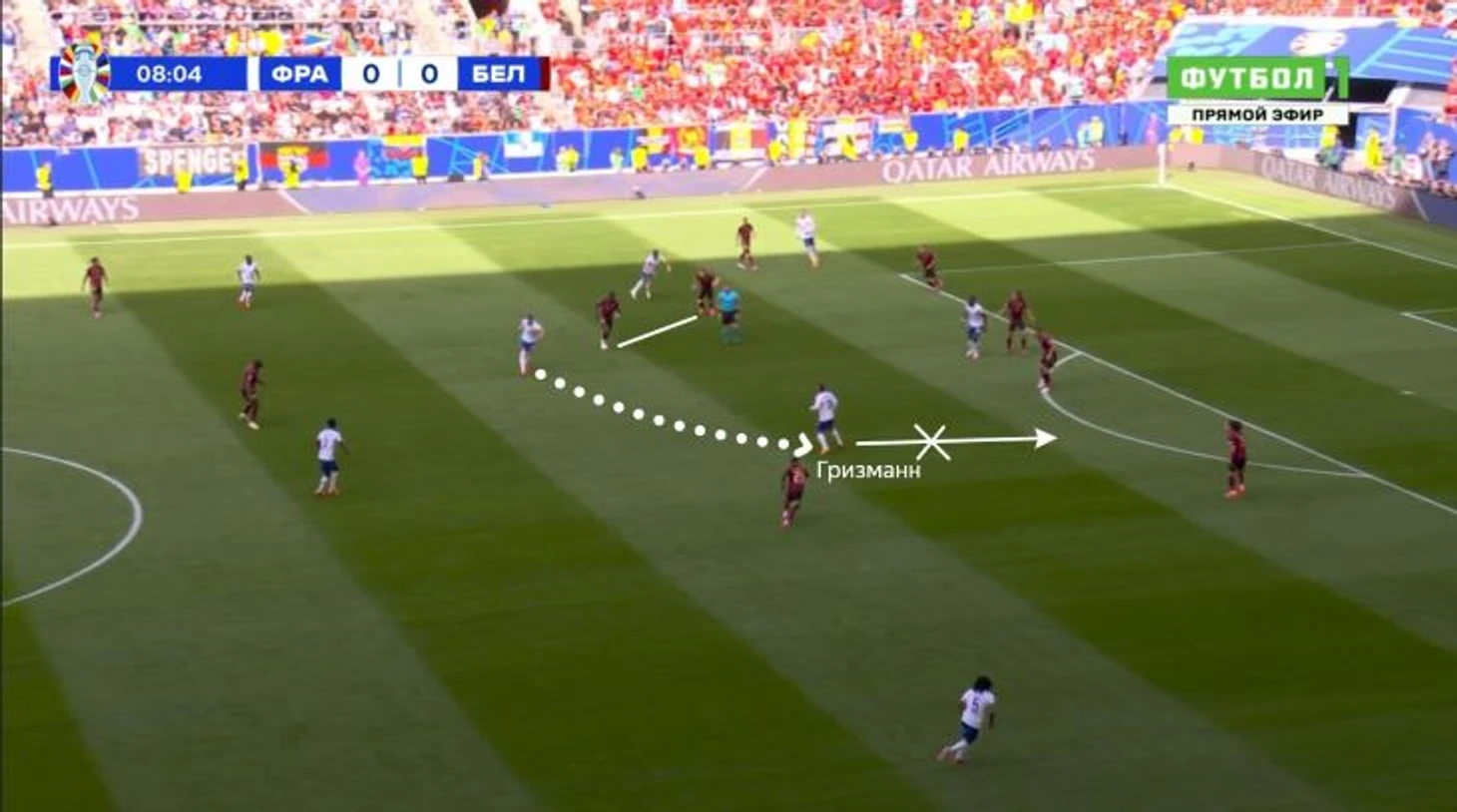 Вот опорники Бельгии излишне сместились вправо. Гризманн заметил это и остался в одиночестве (Жереми Доку отреагировал только в момент передачи), но вместо рывка выше отыгрался с Адриеном Рабьо.