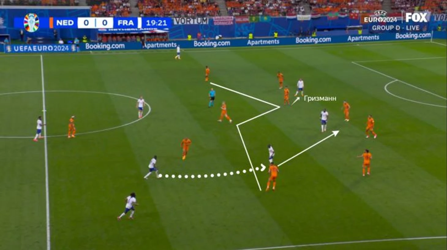 В 2021 году Антуан выходил на позиции вингера в схеме 4-3-3, десятки в 4-2-3-1 и опускался в центр поля против Швейцарии. Сейчас ситуация схожая. В группе он появлялся в свободной роли в 4-3-3/4-2-3-1, в игре с Бельгией стал номинальным правым вингером в 4-3-3, а с Португалией действовал как десятка в 4-3-1-2.