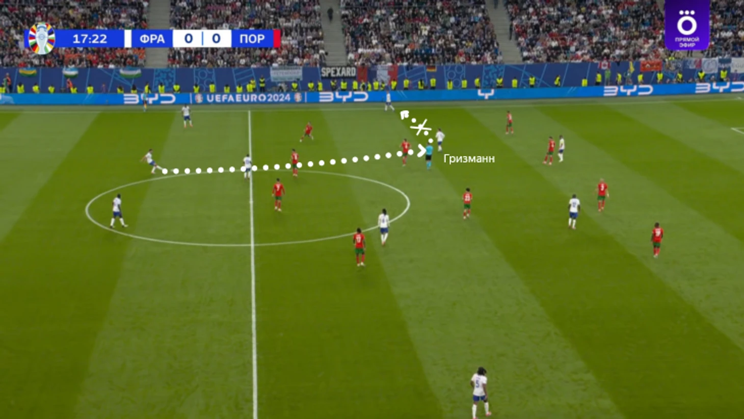 Против Португалии Гризманн открылся за спиной опорников и увидел рывок Канте слева. В итоге он вывел Нголо на прострел из штрафной.