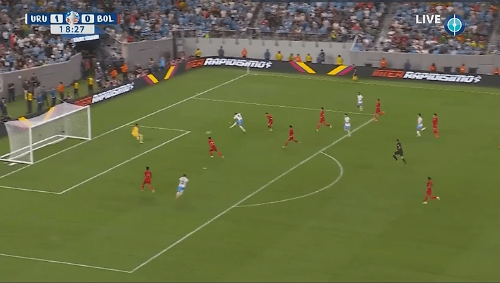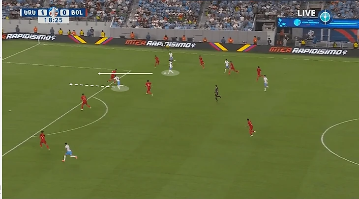 В том же матче против Боливии Дарвин Нуньес имел прекрасные шансы сделать счёт 2:0 (он это сделал чуть позже) после того, как его партнёры по команде сначала вернули мяч после командного прессинга в финальной трети поля, затем, отдав всего 4 передачи, третьей вывели страйкера «Ливерпуля» 1 на 1 с вратарём Боливии.