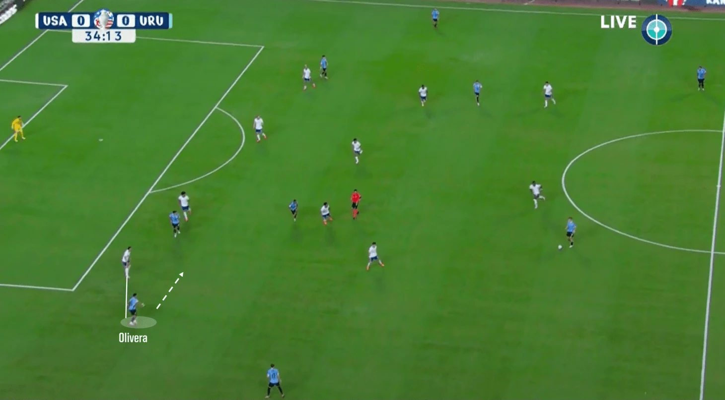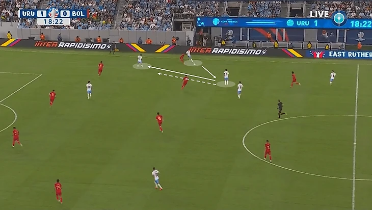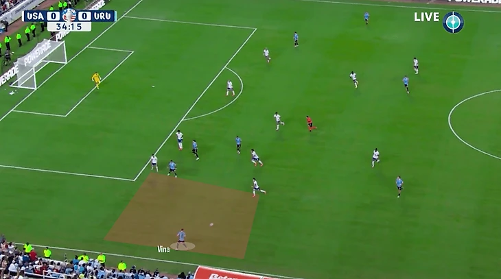 Нижеприведенные скриншоты атаки в матче против США наглядно демонстрируют описанные принципы игры Уругвая при Бьелсе. Кристиан Оливера («Лос-Анджелес», МЛС), игравший вместо Араухо слева, смещается в центр, уводя за собой правого защитника. За спиной остаётся много пространства для Матиаса Виньи («Фламенго», бразильская Серия А), который немедленно этим пользуется и в конце навешивает в штрафную. Оливера даже показывает, куда именно нужно отдать пас защитнику – Винье на фланг.