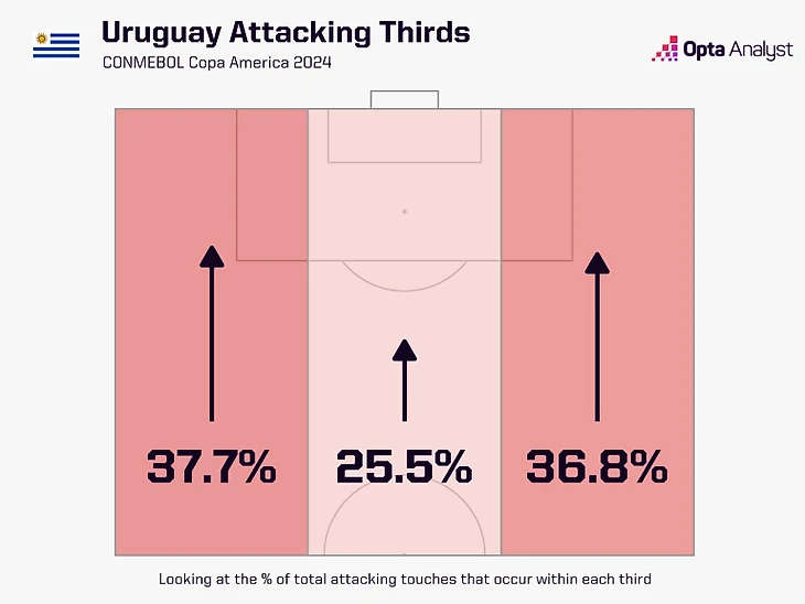 Неудивительно, что на текущем Кубке Америки игроки Уругвая совершили уже 15 навесов с игры, что является третьим результатом на турнире после Мексики и Венесуэлы. Естественно, это отражается на результативности и статистических показателях вингбэков: правый защитник Наитан Нандес («Кальяри», итальянская Серия А) совершает в среднем 5 навесов с игры за матч – пятый показатель среди всех игроков на Кубке, а левый защитник Винья сумел отличиться голом и голевой передачей. И если посмотреть на соотношение направление атак сборной Уругвая, то мы увидим практически идентичные показатели слева и справа.