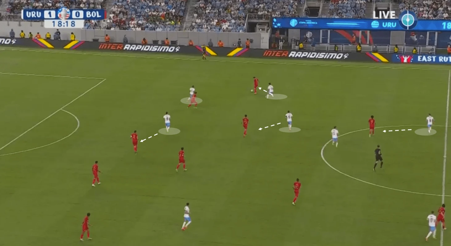 Уругвай стал настоящим кошмаром для соперников. Их «удушающий» прессинг позволил оппонентам выполнить лишь 2.6 последовательные передачи за время владения (в 2021 году показатель был 3.6 последовательные передачи). Кроме того, в этом году на Кубке Америки игроки сборной Уругвая позволяют соперникам продвигать мяч в среднем на 9.3 метра вперёд, тогда как в 2021 году соперник продвигал мяч на 15 метров.