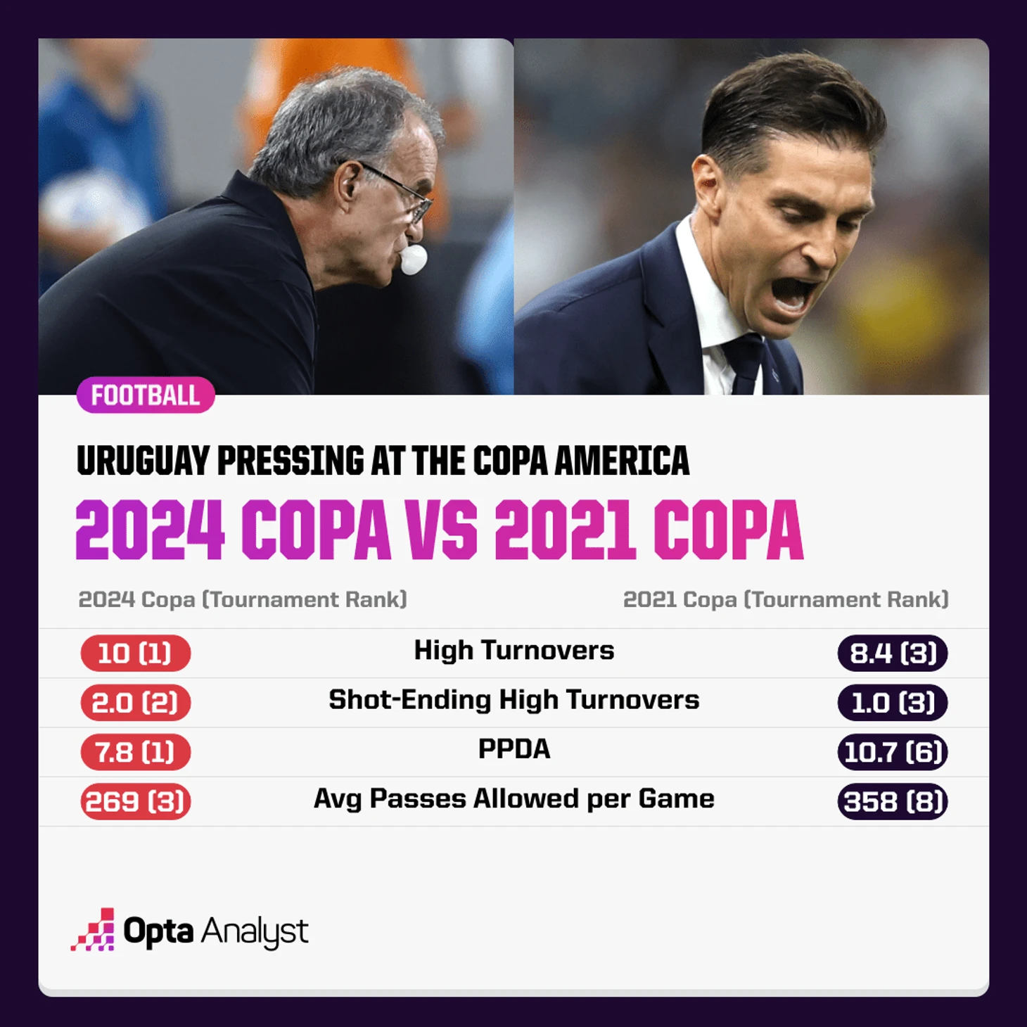 Если сравнить прессинг-показатели сборной Уругвая на Кубке Америки 2021 и 2024 годов, то разница будет значительной: