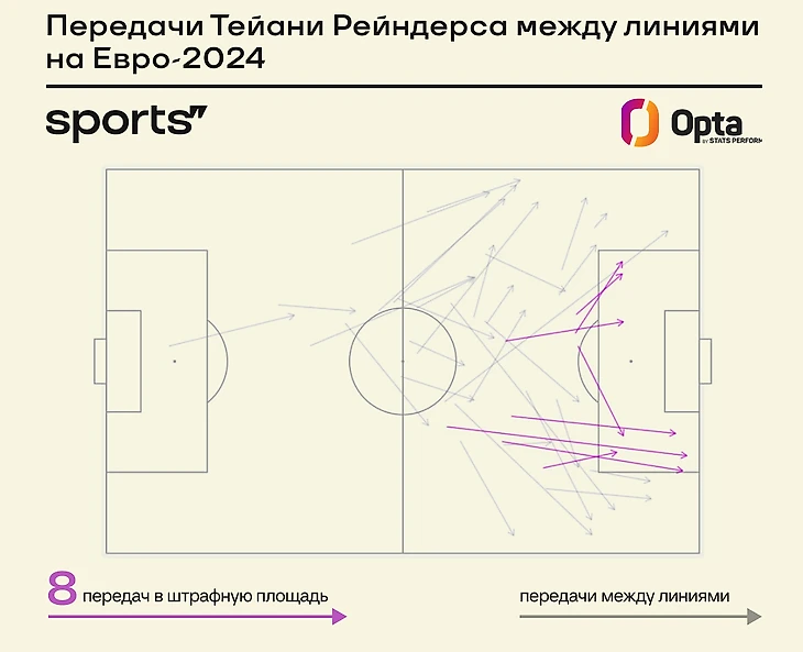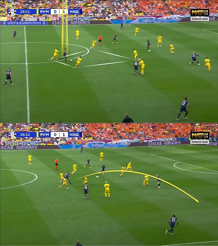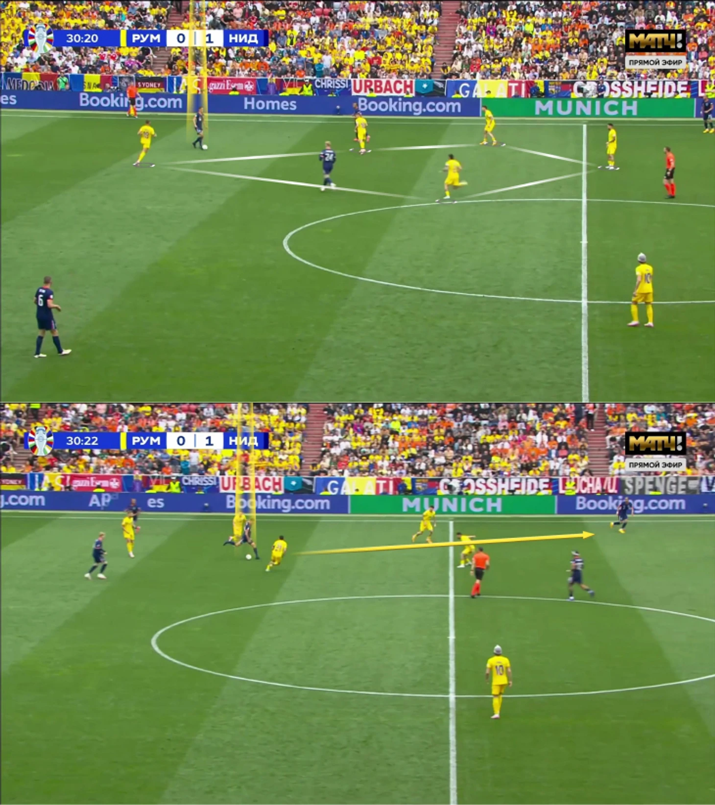 Главный пример – доминирование Рейндерса над Румынией. В этом эпизоде ему хватило пары секунд для оценки ситуации в пять быстрых касаний: ускорился в свободный коридор через опорную зону и шведой бросил на прострел свободному Дензелу Думфрису.