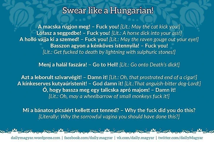 Мадьярская обсценщина – та еще головоломка для изучающих один из самых сложных языков в мире. Венгры по этой части точно дадут фору любому. В самом языке присутствует более 1 млн (!!) варианта глагола «ругаться». Самое популярное – szitkozni. Этот инфинитив означает «браниться». Но если с известной курвой (kurva) все более-менее ясно не только венгру, но и представителю славянских народов, то другие лексемы и фразы так и вовсе могут как минимум ввести в заблуждение, а то и вовсе поставить вас и вашего собеседника в неловкое положение.
