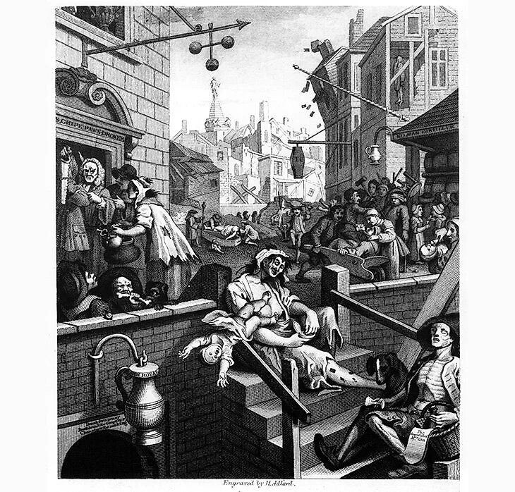 Как выглядел Лондон середины XVIII века, рассказывает гравюра «Переулок джина» (Gin Lane) британского художника Уильяма Хогарта, который жил во времена «джинового безумия» и наблюдал за городом.