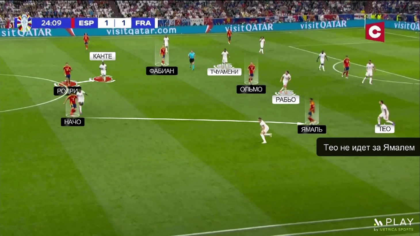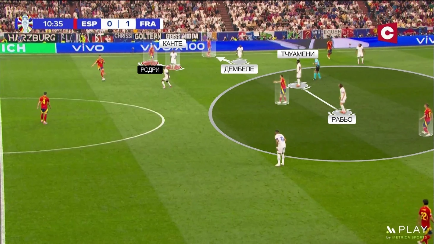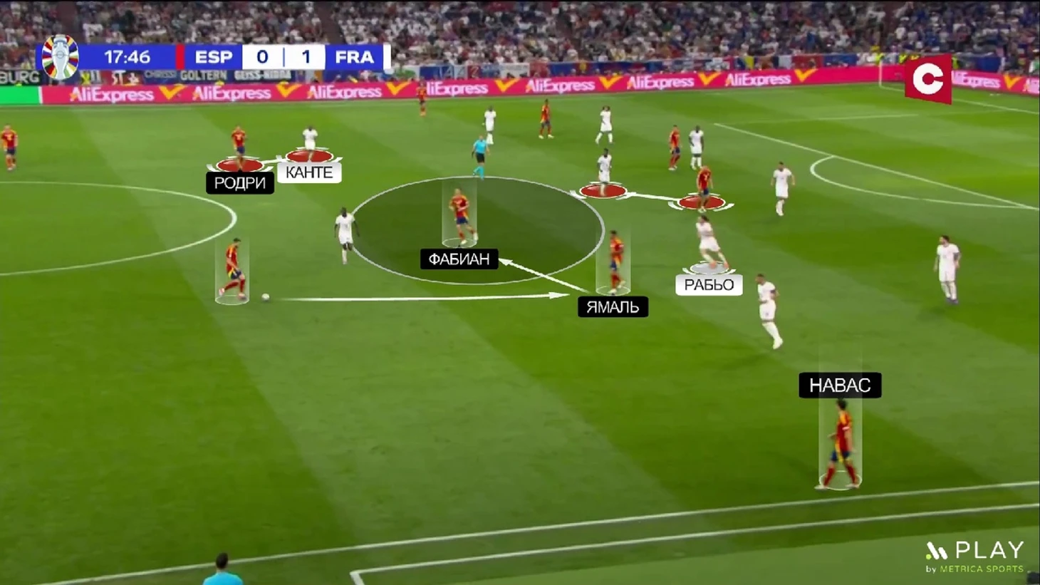 Шедевральный гол Ламина – с одной стороны, просто шальной удар. С другой стороны, этот момент пришел из преимущества Испании в центре поля именно благодаря описанным ходам. Родри увел Канте подальше от центра, а Ямаль сместился в середину – преимущество 3-в-2: