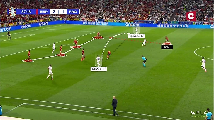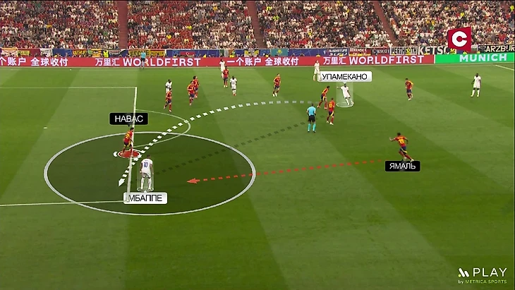 Через фланг Мбаппе Франция провела еще несколько атак, но Испания тоже отвечала и через эту же зону – Ямаль смог уходить в центр в том числе из-за подключений Хесуса Наваса по ширине. Гол Дани Ольмо, например, не пришел бы без подачи Наваса.