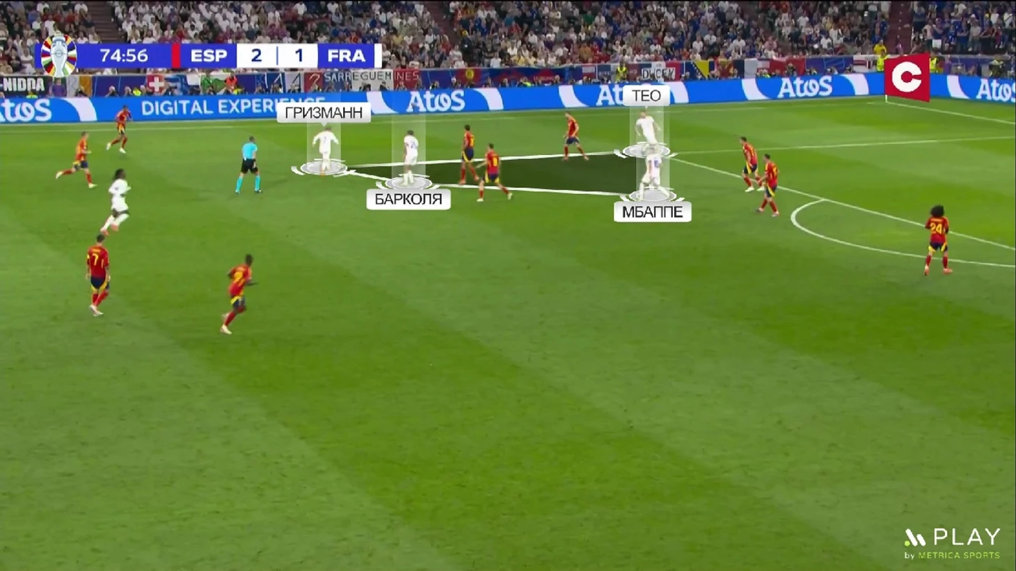 Первый ход Дешама – тройная замена на 62-й минуте. Вышли Камавинга, Гризманн и Барколя. Это попытка воссоздать комбинационный левый фланг с Барколя, Тео Эрнандесом и смещениями в эту зону Мбаппе и Гризманна: