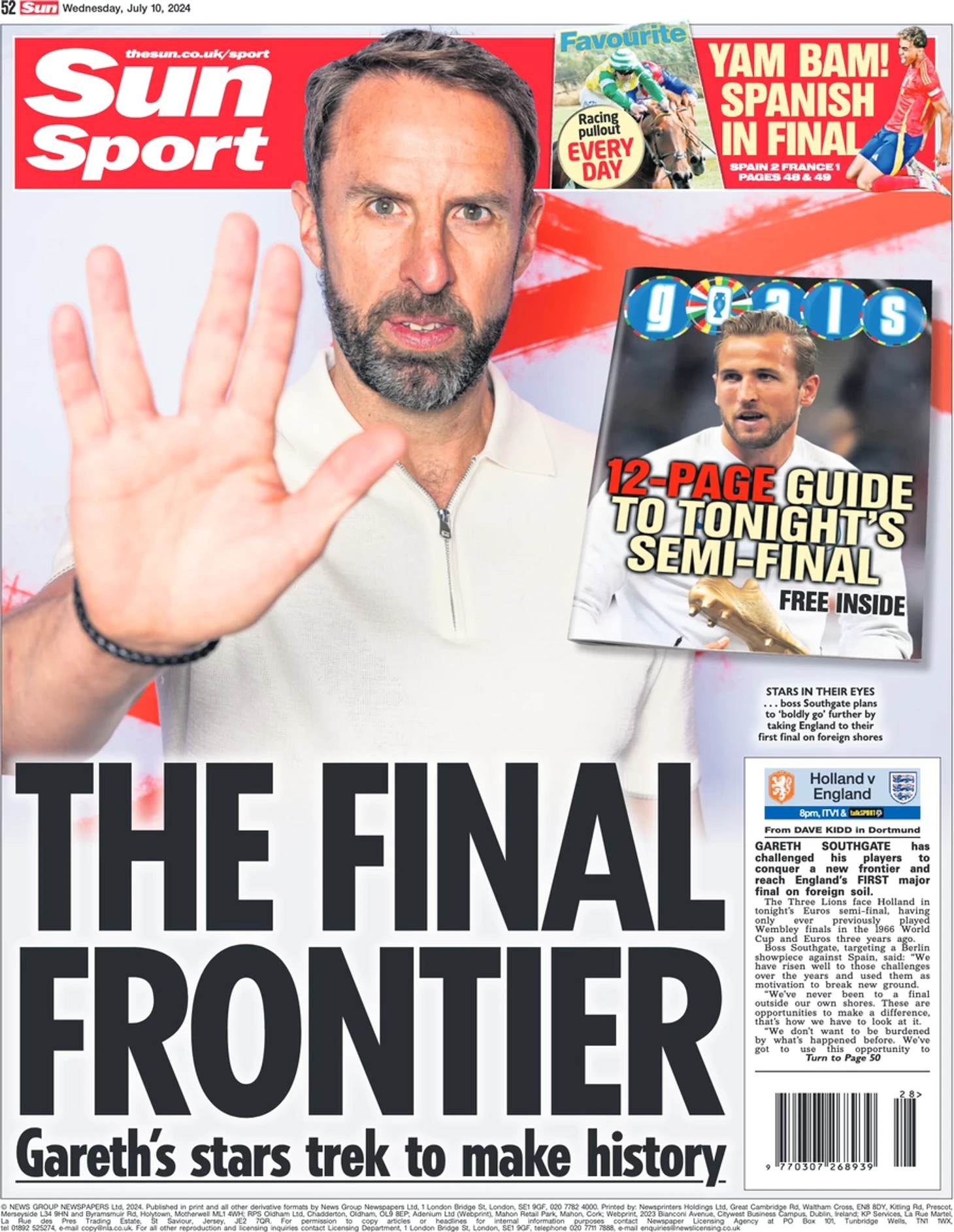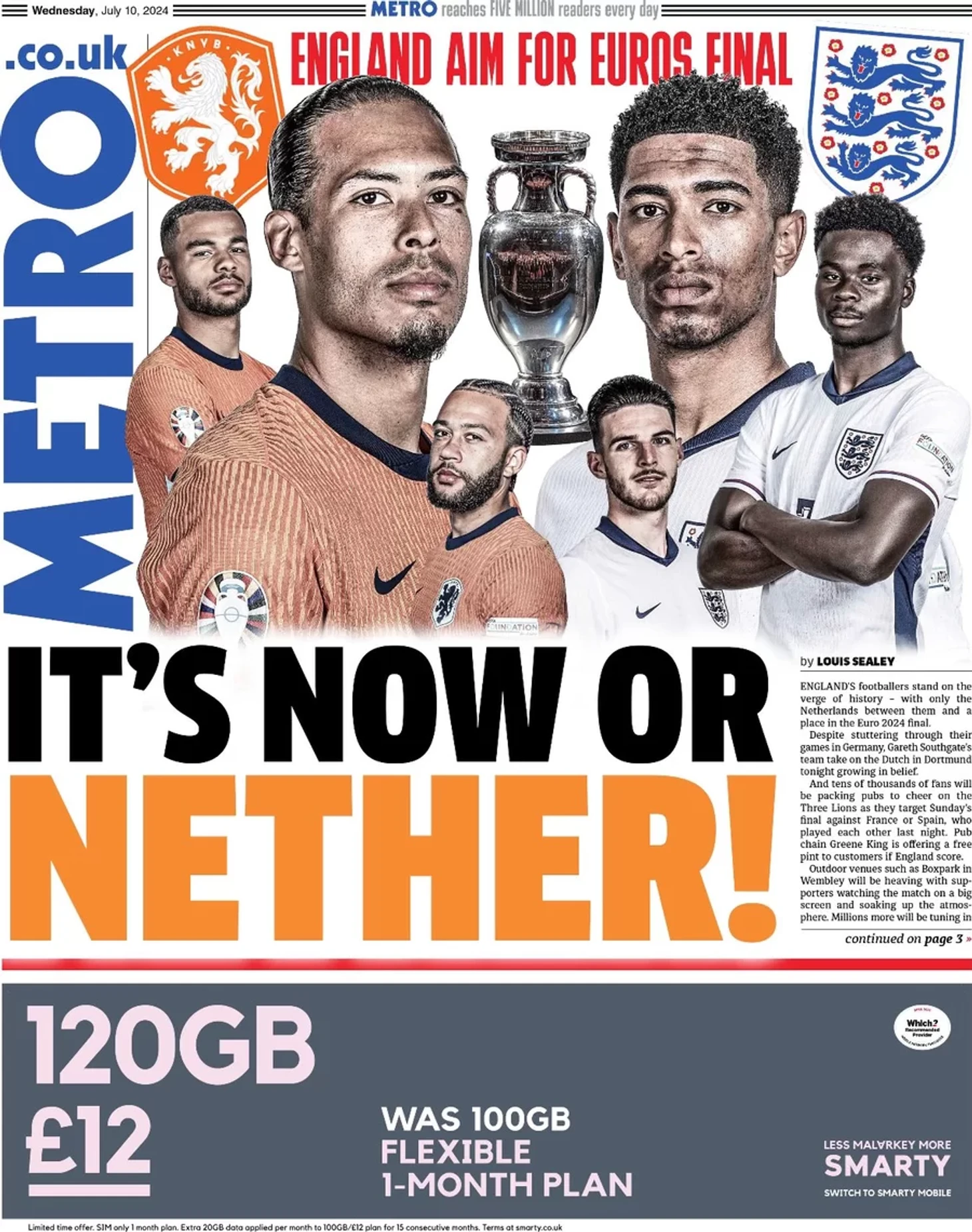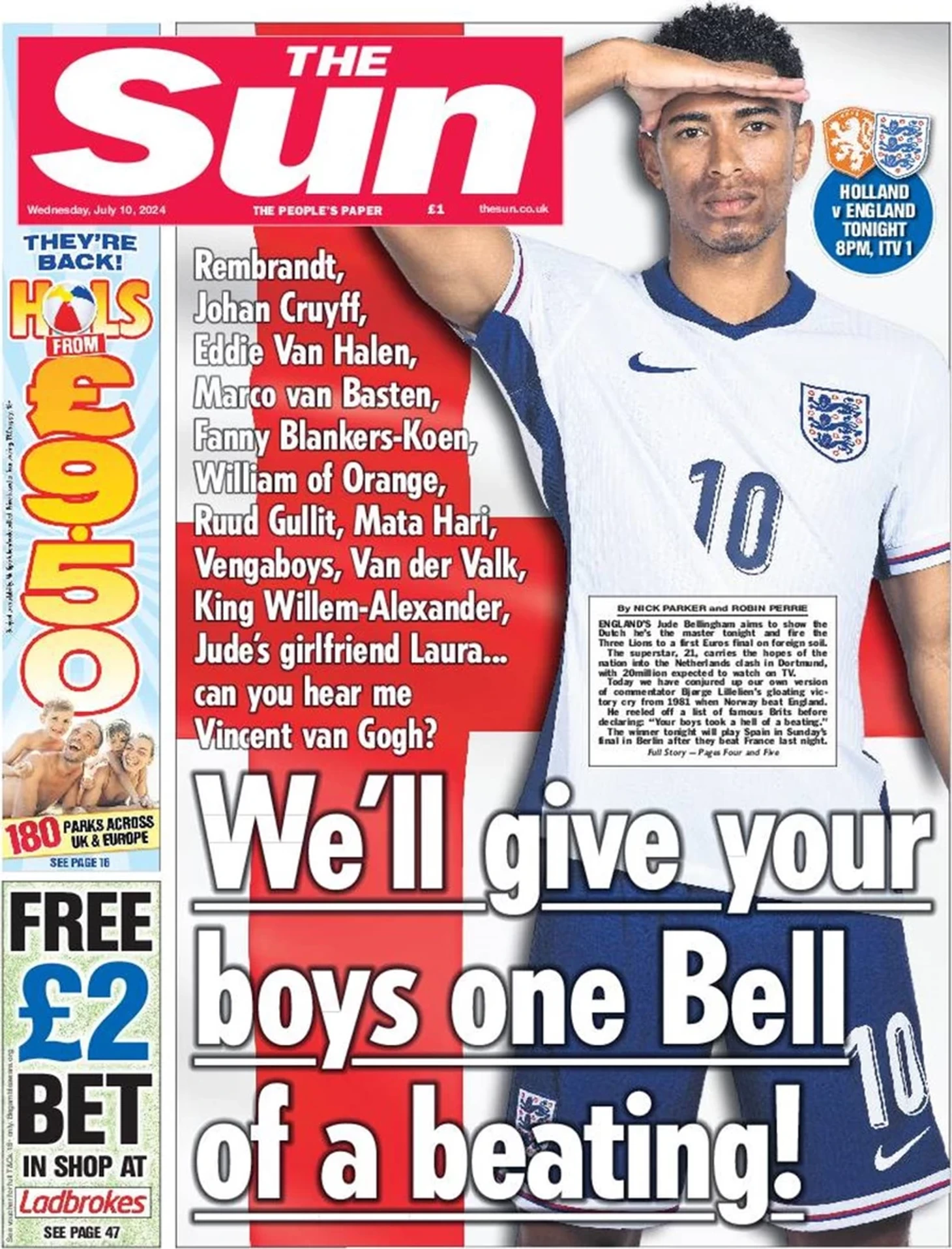 В обложке The Sun начну сразу с контекста: в 1981 году сборная Англии сенсационно проиграла Норвегии (1:2) в отборе на чемпионат мира и норвежский комментатор Бьёрге Лиллелиен перечислил список известных британцев, а затем в адрес Маргарет Тэтчер добавил «Мэгги Тэтчер, Вы меня слышите? [...] Мы адски поколотили ваших парней!» (Your boys took a hell of a beating). Подробнее про эту историю и весь монолог читайте по ссылке. The Sun решила вспомнить этот монолог, перечислила известных голландцев: Рембранд, Кройфф, ван Хален (гитарист), ван Бастен, Бланкерс-Кун (четырехкратная олимпийская чемпионка), Вильгельм Оранский (правитель), Гуллит, Мата Хари, Vengaboys (музыкальная группа), Van der Valk (семья и одноименная сеть отелей), девушка Беллингема Лаура... Ты слышишь меня, Винесент Ван гог?" и обыграла hell и Bell – Беллингема. Получилось что-то вроде "Мы дадим вашим парням одного Белла, чтобы вас побить".