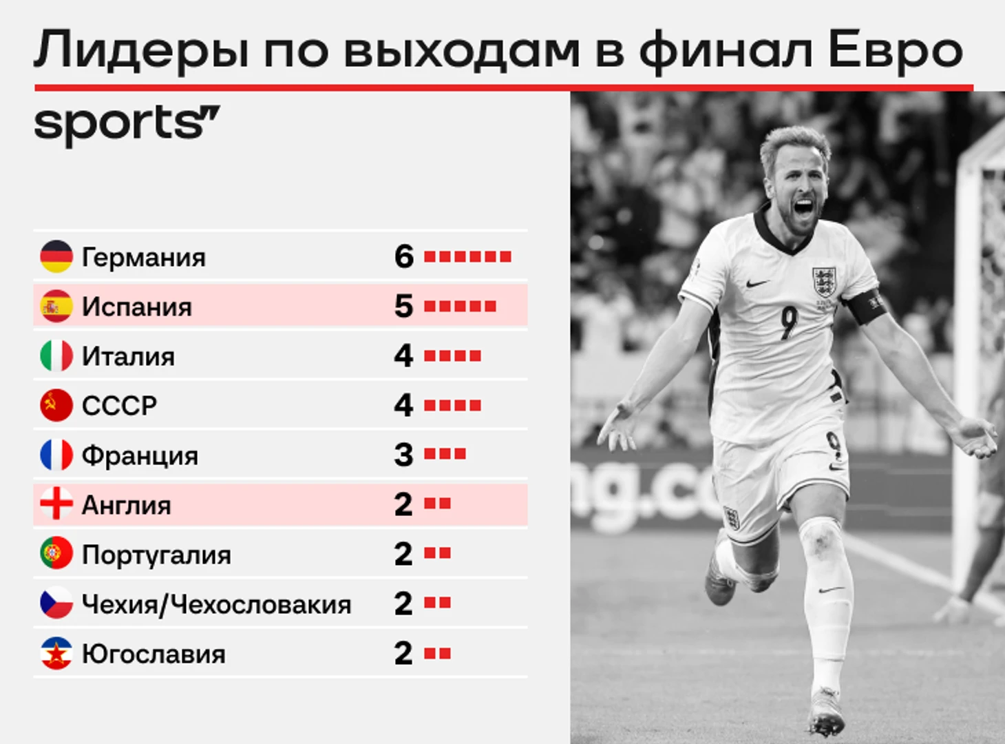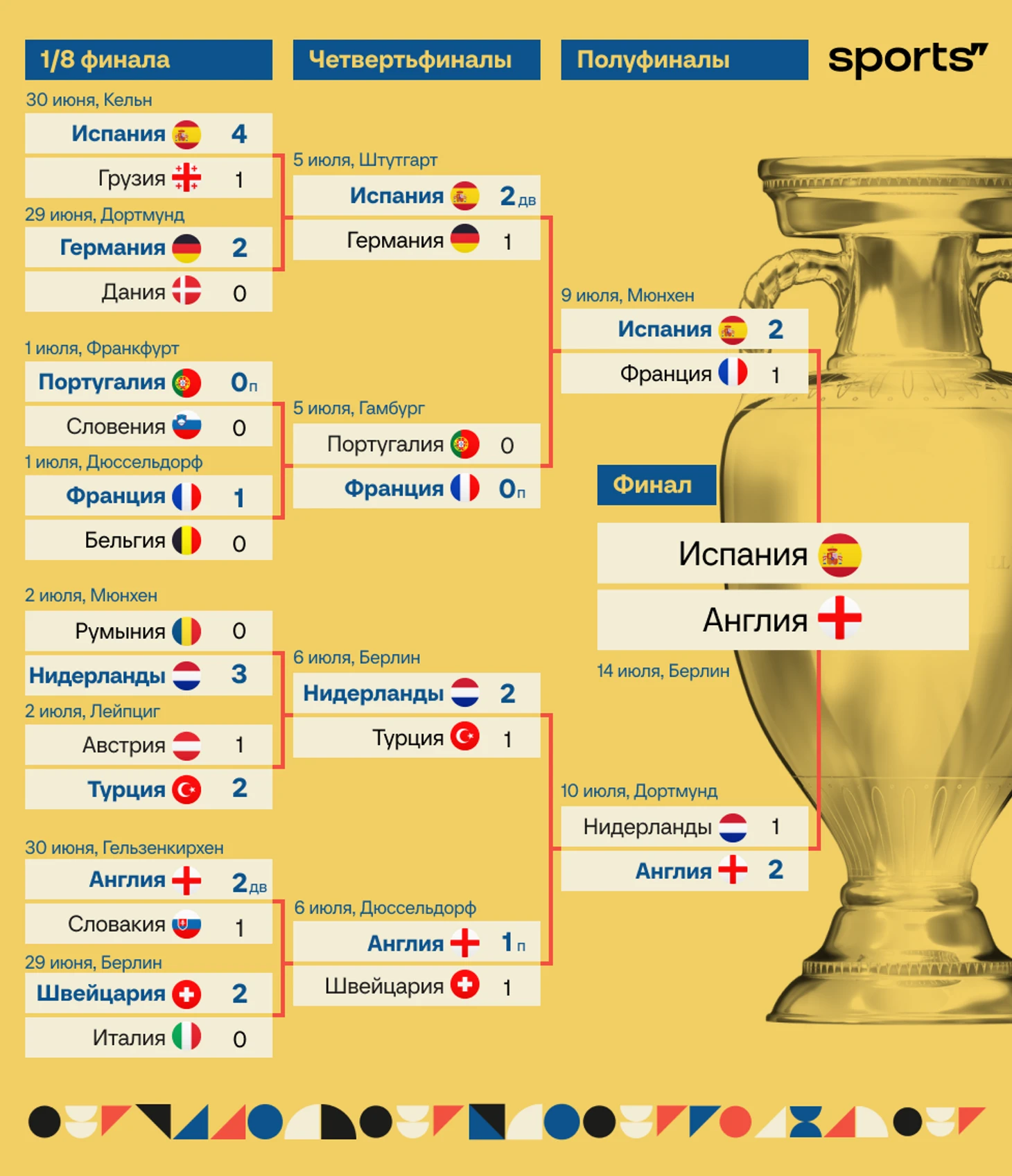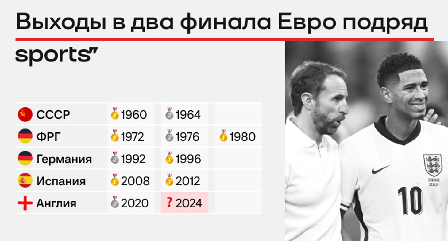 ● Англия второй раз подряд в финале Евро. Три года назад в полуфинале обыгрывали сенсационную Данию, но в решающий момент отдали титул Италии.