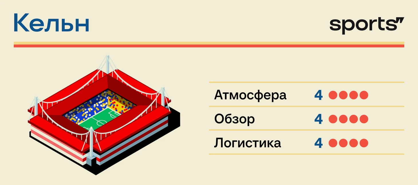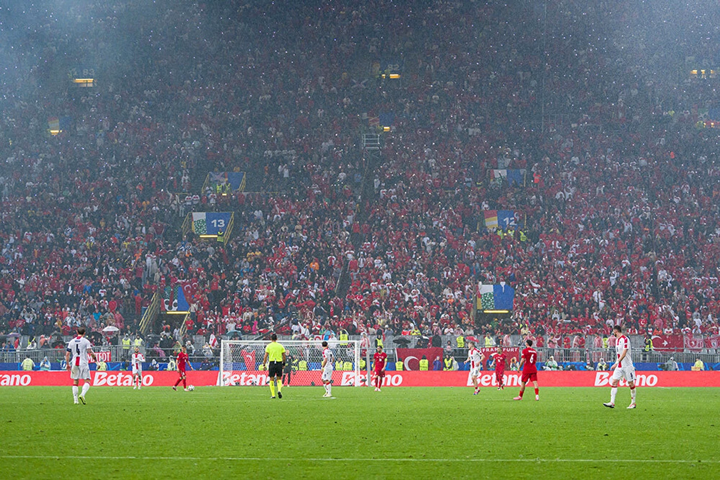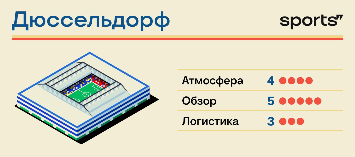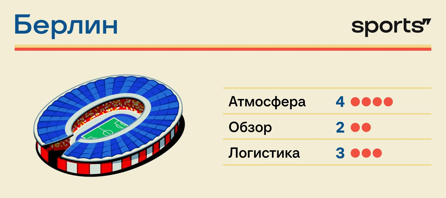 Из-за расстояния от поля до трибун даже с премиальных мест на Олимпийском стадионе в Берлине очень плохой обзор. Всматриваешься, напрягаешься и теряешь ощущение, что ты внутри и видишь игроков вживую. Отсюда самая низкая оценка – больше таких стадионов на турнире нет. При этом архитектурно арена выглядит классно: эстетика олдскула, которому очень подходят ультрас и зажженные файеры.