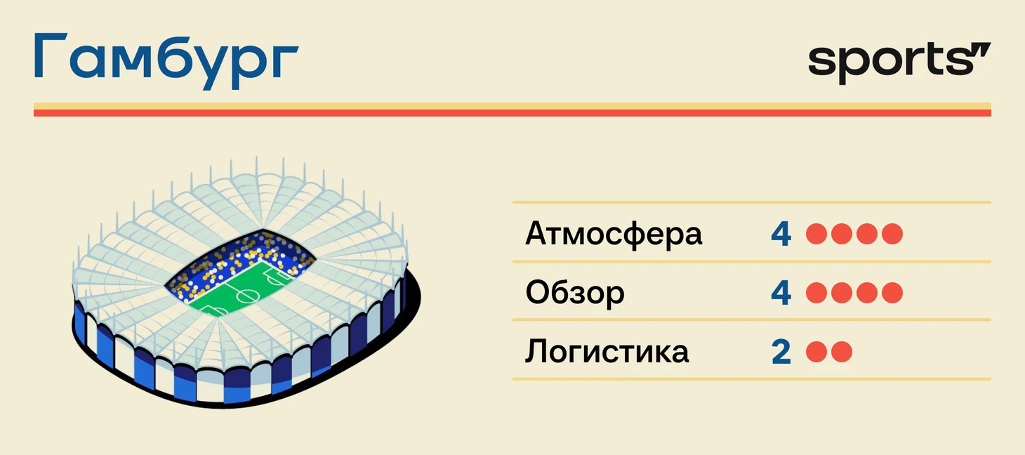 Только с логистикой снова не очень. Метро (оно, конечно, встает в дни матчей), а потом еще пешком от станции больше километра. Когда идешь на игру с болельщиками, это еще нормально и атмосферно, а вот домой все-таки хочется побыстрее. Я, кстати, ставил Гамбург выше в рейтинге, но коллега Курчавова его спустила! Ей слово.