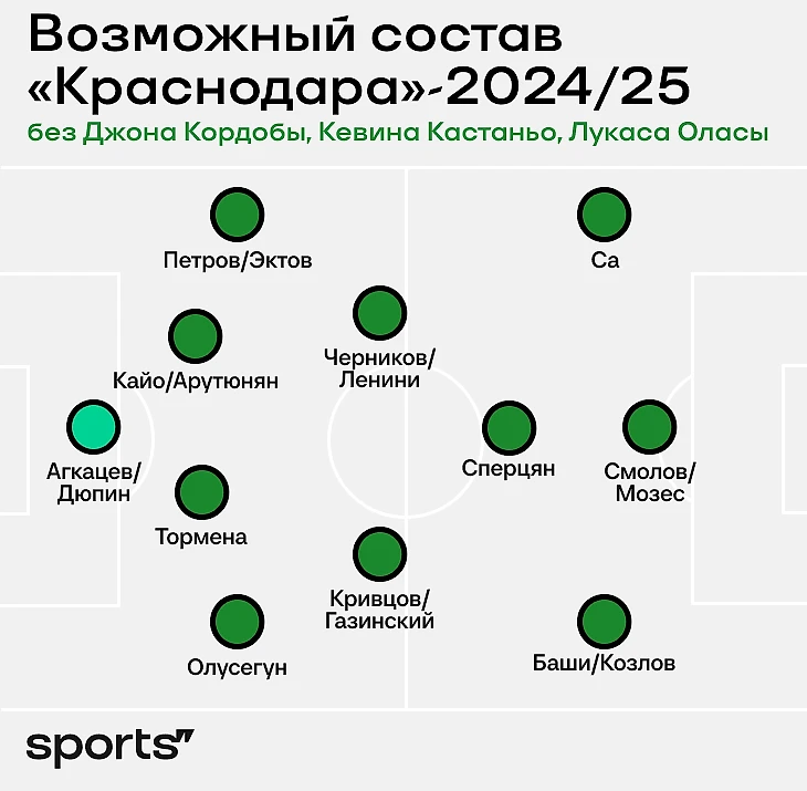 1. В прошлом сезоне Владимир Ивич строил фундамент вокруг вратаря Матвея Сафонова, защитников Лукаса Оласы, Хуниора Алонсо, Витора Тормены, спустившегося в опорную зону Эдуарда Сперцяна и нападающего Джона Кордобы. Мурад Мусаев опирался на тех же лидеров, но сейчас ему доступны только Сперцян и Тормена: Сафонов и Алонсо покинули «Краснодар», Оласа и Кордоба на Копе, там же Кевин Кастаньо (по словам Мусаева, каждый из латиноамериканцев получит 7-10 дней отдыха после завершения турнира). Кроме того, правый защитник Волков перешел в «Зенит», центральный полузащитник Михайло Баняц арендован, творческий Кади теперь в «Ференцвароше».