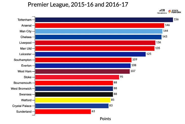 Если суммировать эти два сезона, получится интересная картина: «Тоттенхэм» – лидер по очкам (156), на 10 баллов впереди ближайшего преследователя, «Арсенала». Кроме того, «Тоттенхэм» больше всех забил (155), меньше всех пропустил (61), и у них была лучшая разница мячей (+94).