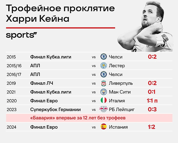 Но ладно, если серьезно, у Кейна действительно нет ни одного официального трофея за карьеру. Ни со сборной, ни с клубом. Не помог даже переход в «Баварию», которая годами брала по несколько чашек.