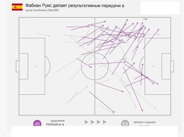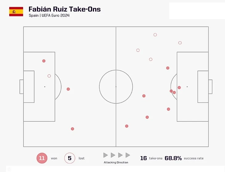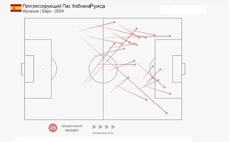Прогрессивные передачи великолепны, поскольку он продвигает команду по всему полю. Прорывные передачи ещё лучше, поскольку они могут нарушать форму соперника. Это ещё одна область, где Фабиан преуспел. Он выполнил больше всего разящих передач, чем кто-либо другой в сборной Испании, кроме Лапорта, но, честно говоря, он пытался нарушить линию полузащиты, которые, как правило, обойти сложней, чем линию атаки. Единственные игроки на Евро 2024, которые обходили больше, чем Руйс (41), Гранит Джака (47) и Кросс (50).