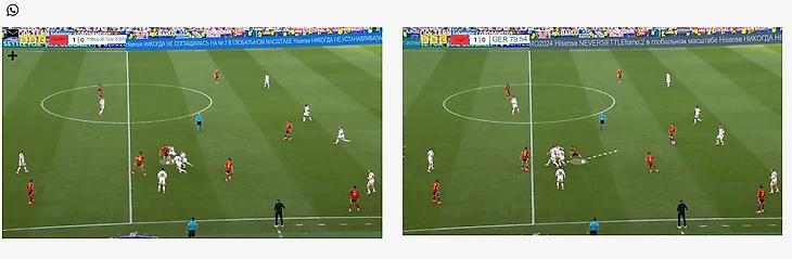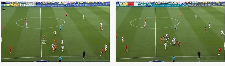 Это пример того, как избежать давление трех немецких защитников, показывает, насколько хорошо он манипулирует мячом в труднодоступных местах. Он получает пас от Микеля Мерино с боковой линии, сталкивается с тремя немецкими игроками, приближающимися к нему.На самом деле, Фабиан наносит несколько сильных ударов, поощряя немецкую прессу. Он способен дотянуться до мяча и взять его под контроль, прежде чем использовать трех немецких игроков против них самих, делая сложный выпад назад, прежде чем уйти вперед в пространство.