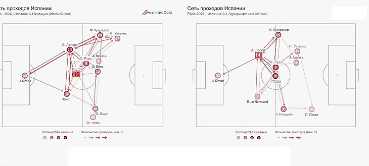 Но где бы он ни оказался с мячом, это в основном происходит на левом фланге вне формы соперника. Фабиан занимает центральное место в структуре владения мячом Испаний. Карта пасов двух последних игр на выбывание против Германий и Франций.