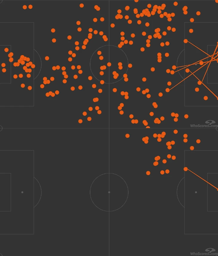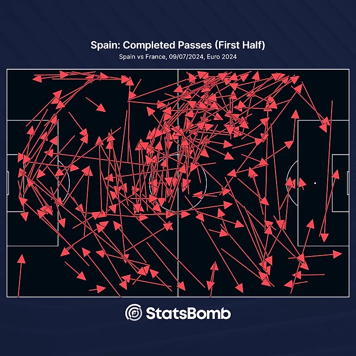 3. Переходы Испании с левого фланга на правый. 59% атак шли слева, 23% через середину и всего 19% справа. Команда группировалась в зоне Уильямса – Кукурельи (Ольмо помогал комбинировать или хитро врывался в штрафную с Руисом), после чего внезапно переходила направо, откуда угрожал Ямаль (помогали Мората, Хесус Навас и все тот же Ольмо).