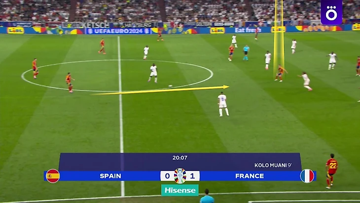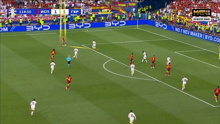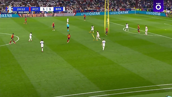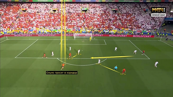 Ольмо организовал атаку перед космическим голом Ямаля. Смело открылся даже не за спинами опорников, а между Рабьо и Тчуамени, затем молниеносно развернулся, укрыл мяч корпусом и высмотрел Морату. Пас не получился, но мяч удачно отскочил к Ламину.