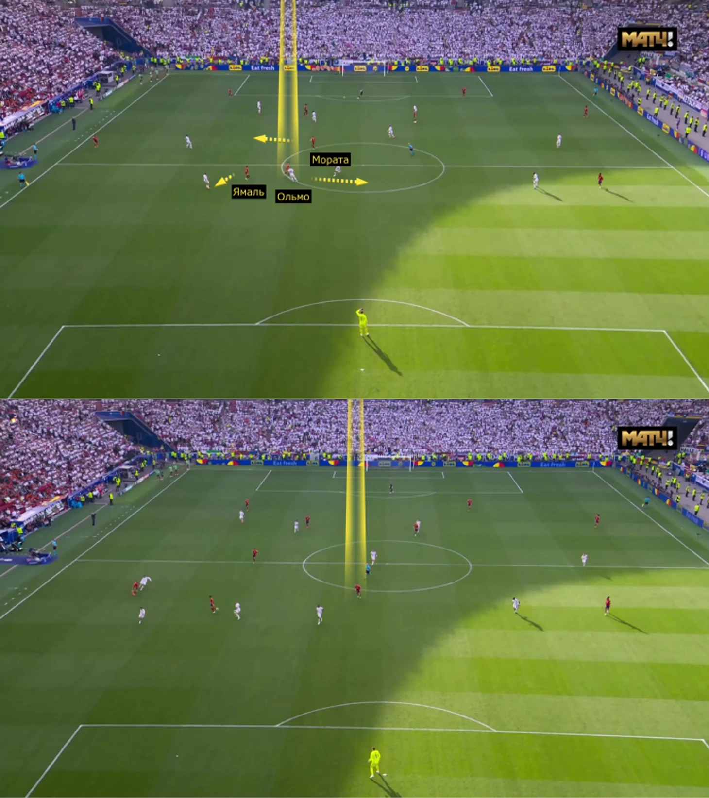 Например, здесь видно, как Ольмо посадил Крооса к защитникам, ушел в сторону (сбросил Тони благодаря движению Ямаля и Мораты), затем завис на расстоянии от Рюдигера – благодаря этим маневрам Испания получила свободу в центре и закрепилась на чужой половине перед моментом Мораты.
