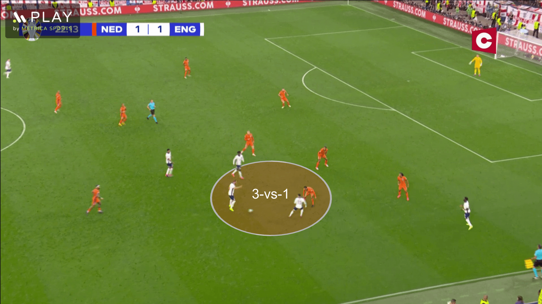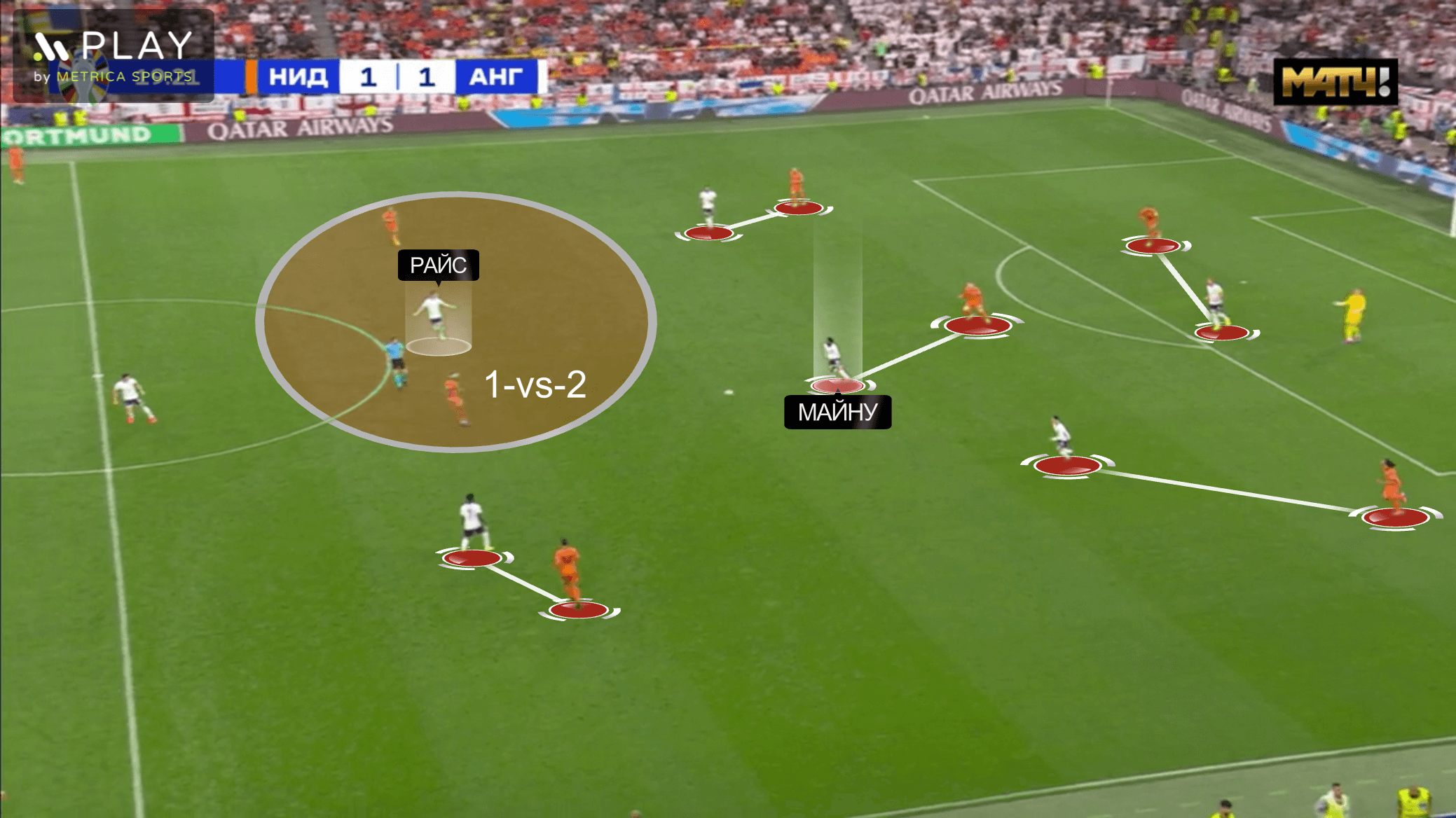 К тому же в прессинге Англии появляются дыры. Вот карикатурный эпизод из игры с Нидерландами, когда Майну пошел в давление, а Деклан Райс остался без поддержки и начал махать руками. Не вина Кобби – просто показатель того, что прессинг Англии далек от идеала, даже когда есть намерение: