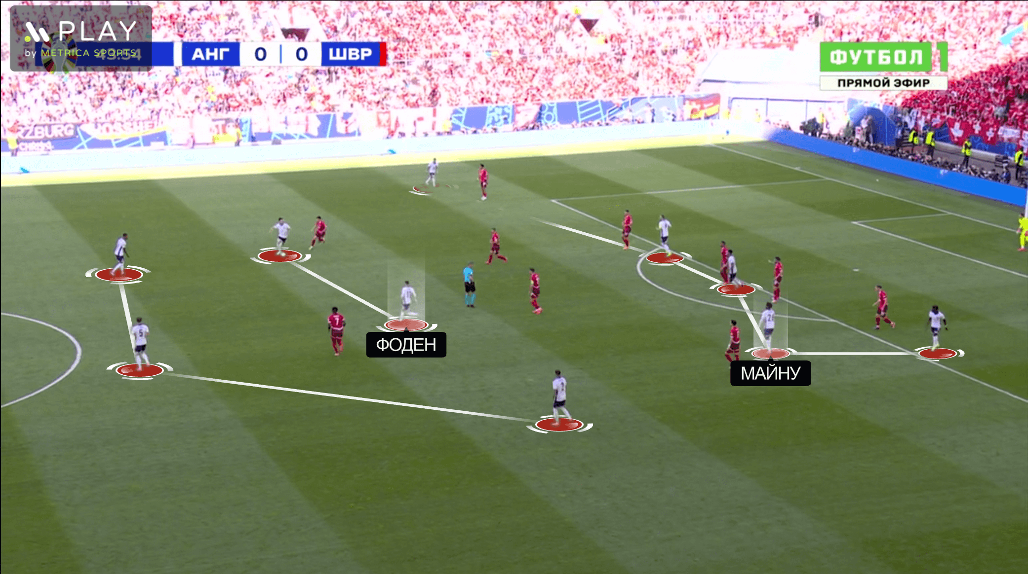 Проще распознать влияние Майну по матчу со Швейцарией. Тогда тоже включали прессинг и тоже эпизодически проваливались. Зато, возвращаясь на свою половину, неплохо сдерживали основной левый фланг у соперника. Кобби был ключевым участником: располагался ближе к этой зоне и помогал партнерам, которые формировали пятерку защитников. Провалов не было, Швейцарии в какой-то момент даже пришлось перенести атаки направо: