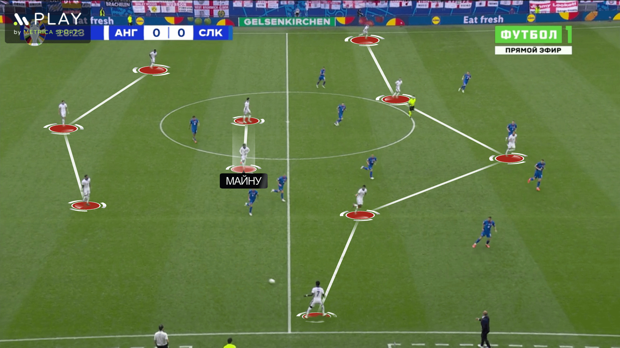 Итак, Кобби не улучшил качество игры Англии радикально. Скорее нужно говорить о стиле, который наконец-то начал меняться. С появлением Майну Англия заиграла смелее. Да-да, на старте Евро были не просто скучными, а еще и до боли трусливыми. Закрывались на своей половине, открывая счет. Всей командой говорили, что нужно прессинговать, но, когда доходило до прессинга, не понимали, какие механизмы включать. Харри Кейн рассказывал, что схему Дании с тройкой ЦЗ сложно задавить, когда нет поддержки из глубины.