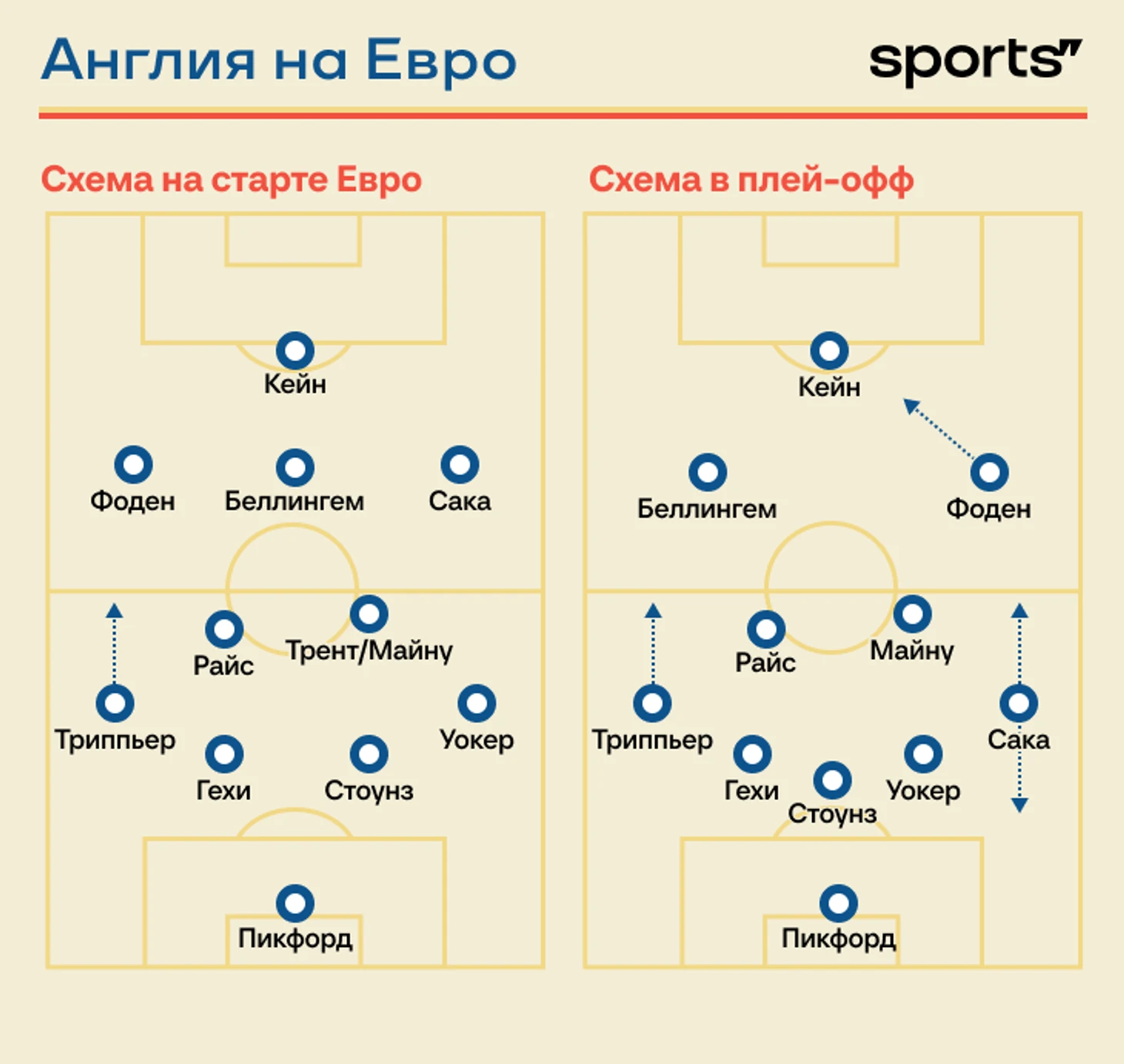 Максимум, который позволил себе Саутгейт по пути к финалу, – косметические изменения. Начинали в схеме 4-2-3-1, в которых Сака и Фоден расставлены по флангам атаки, а Джуд стартует десяткой.