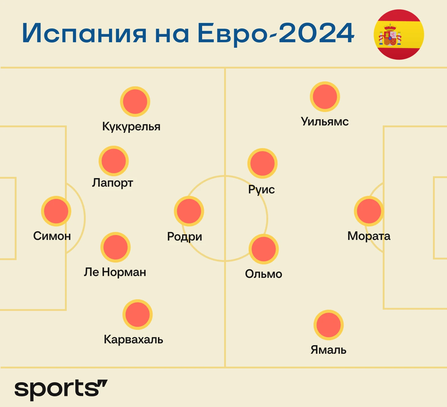 ● У Испании максимально строгий стартовый состав и сочетание в центре – Родри, Руис, Педри. Изменения в нем случились только из-за травмы последнего – открылась дорога для Дани Ольмо, который встал в освободившийся слот.