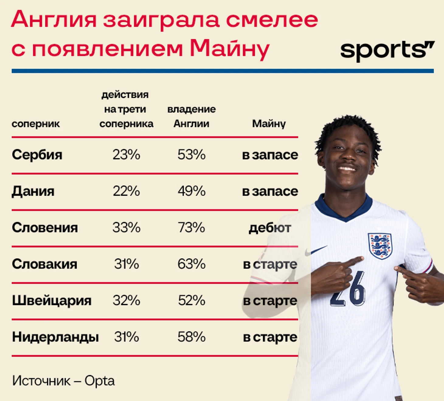 В плей-офф ситуация изменилась – Англия наконец-то заиграла смелее. Смена настроения совпала с внедрением Кобби Майну (второй тайм игры со Словенией). Теперь чаще доминируют и намного больше владеют мячом.