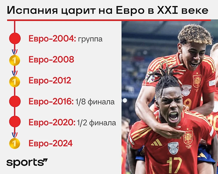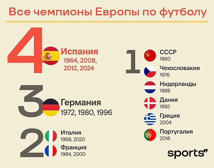 ● Испанцы – единоличные лидеры по титулам чемпионов Европы. У них четыре, обогнали немцев. Для Испании это первое золото после династии-2008/2012.