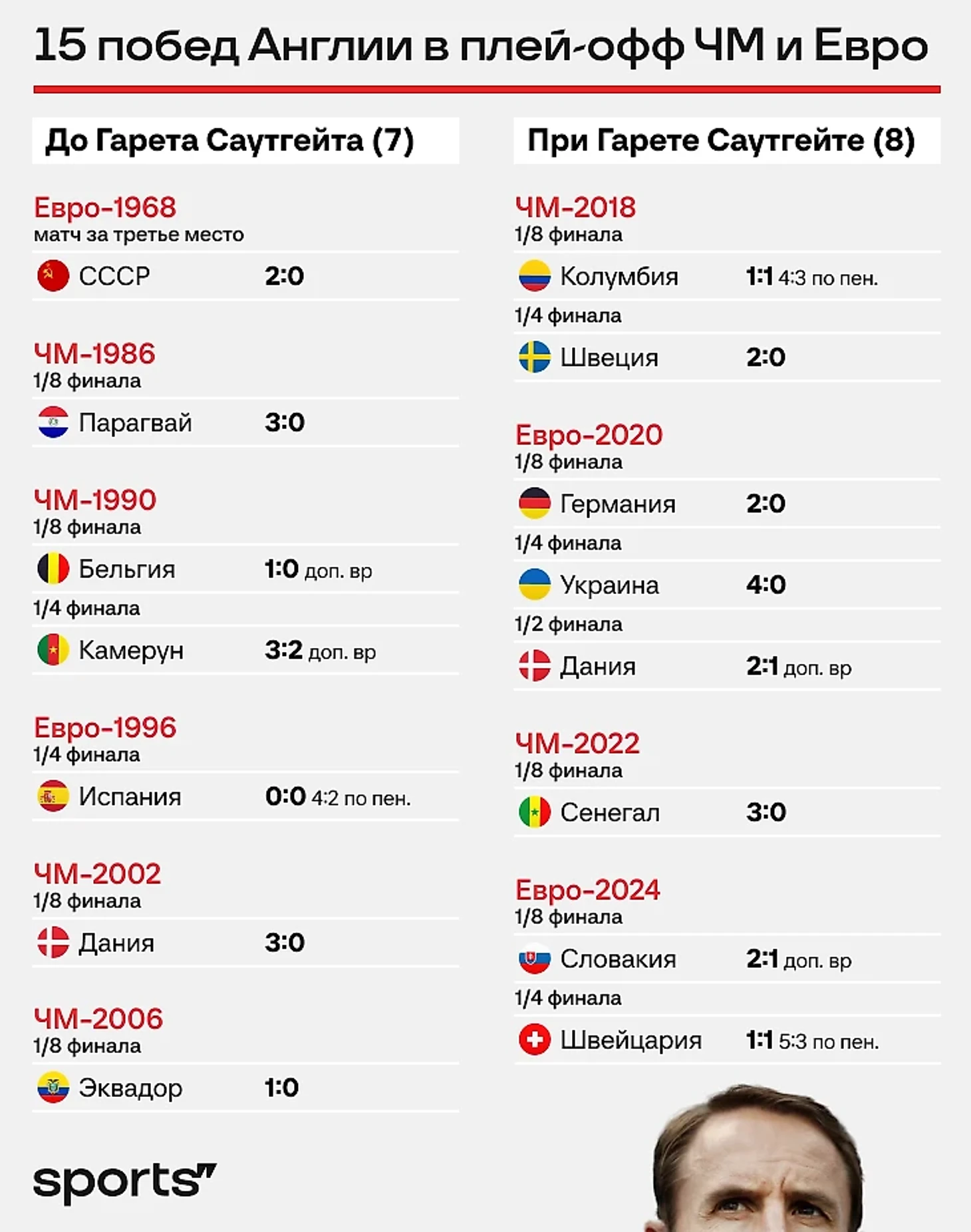 Лучшие результаты Англии после золота ЧМ-1966: финал Евро-2020 (Саутгейт), бронзы Евро-1968 (Альф Рамси) и Евро-1996 (Терри Венейблс), четвертые места на ЧМ-1990 (Бобби Робсон) и ЧМ-2018 (Саутгейт).