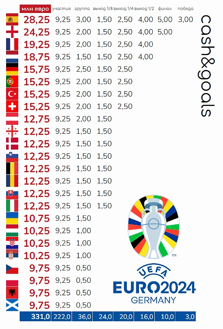 cash&goals уже писал о том, сколько УЕФА ожидает заработать на Евро-24 (2,4 млрд евро) и какая часть этой суммы достанется клубам (240 млн евро) и сборным (331 млн евро). Напомню, УЕФА впервые не увеличил выплаты сборным, оставив их на уровне Евро-2020.