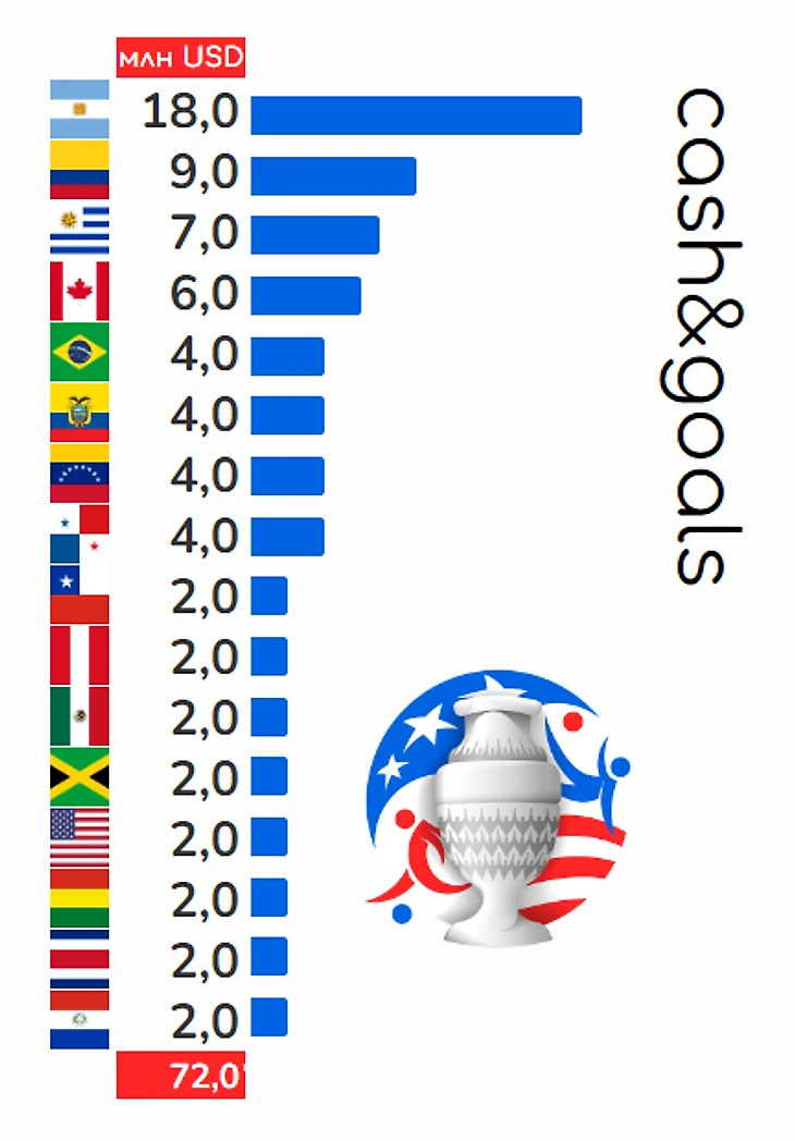 А вот на Copa America, несмотря на увеличение по сравнению с прошлым розыгрышем, призовые скромнее. Суммарно сборным выплатят 72 млн долларов (около 66 млн евро или 4,1 млн евро в среднем на сборную, на Евро-24 – 13,8 млн), четверть из которых достанется сборной Аргентины (18 млн долларов или около 16,5 млн евро).
