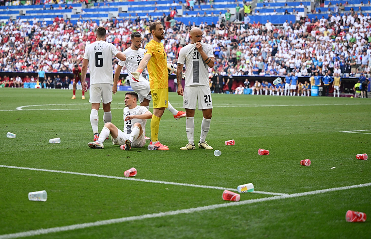 Словения – Сербия. Грусть словенцев среди мусора, который накидали сербские фанаты перед спасительным голом Йовича.