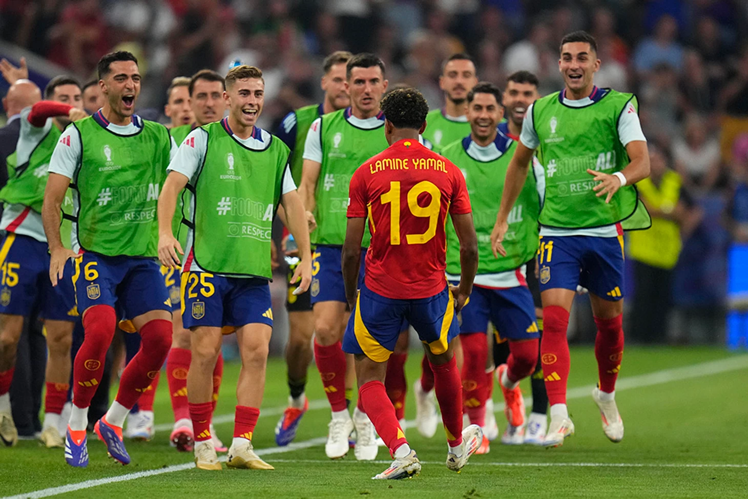 Испания – Франция. А в этих взглядах – восторг и восхищение. Тогда еще 16-летний Ламин Ямаль забил красоту французам и только что побил несколько новых рекордов.
