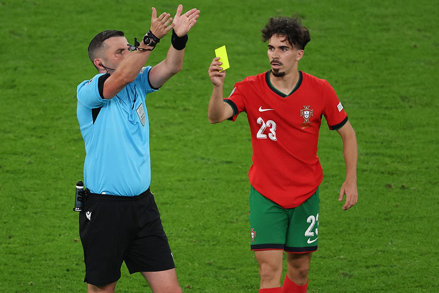 Португалия – Франция. Витинья дает потерянную желтую карточку Майклу Оливеру.