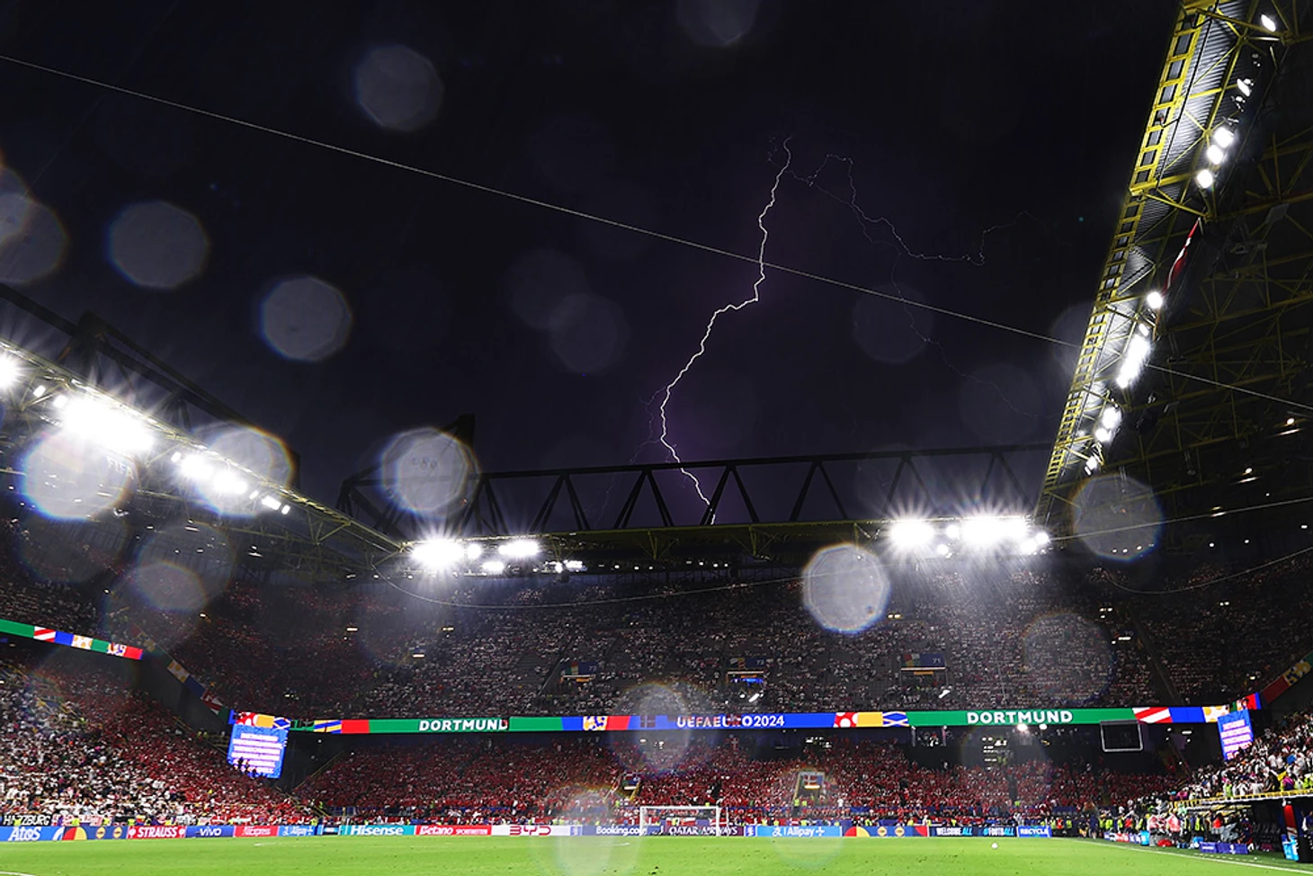 Этот ливень с молнией и градом прервал матч в Дортмунде на 25 минут.